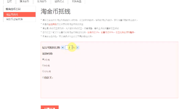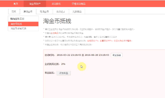 在开通之后会分有淘金币全店抵钱比例和单品抵钱比例。